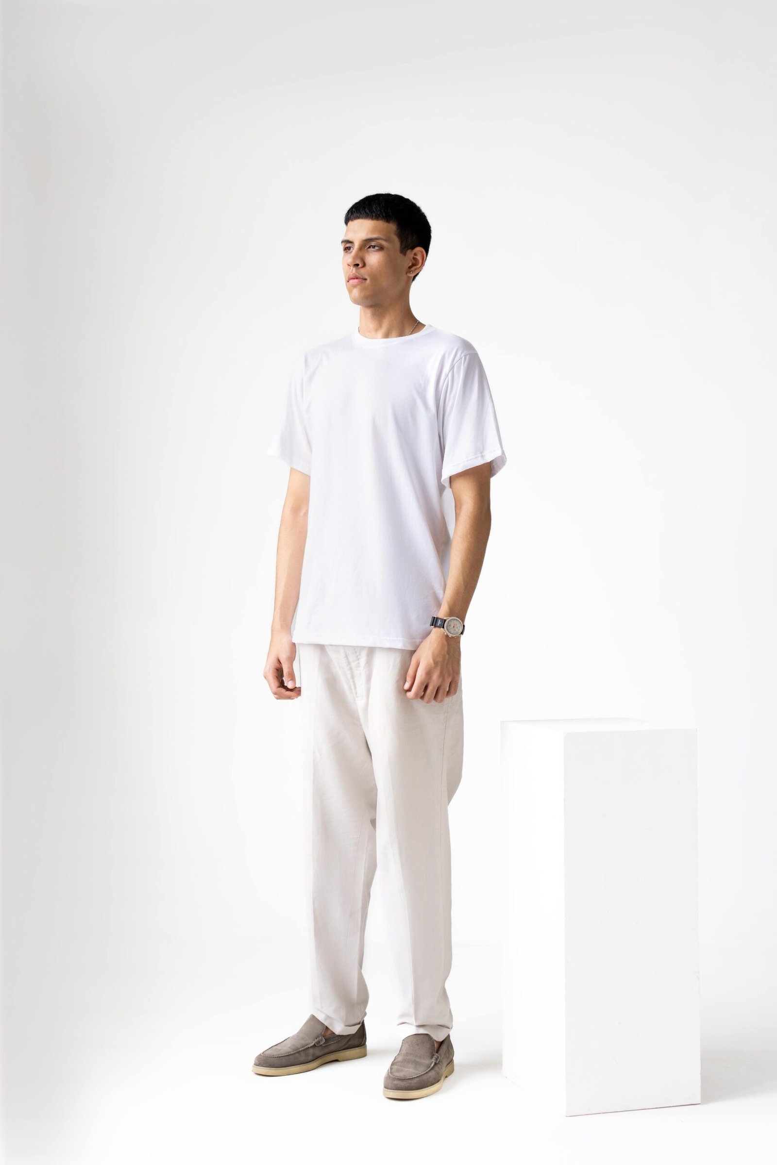 Elevate your everyday style with this classic White T-shirt, crafted from 100% premium cotton for unparalleled softness and comfort. Its relaxed fit, round neck, and short sleeves make it a versatile essential for any casual wardrobe. Whether paired with jeans or shorts, this T-shirt is perfect for effortless style.